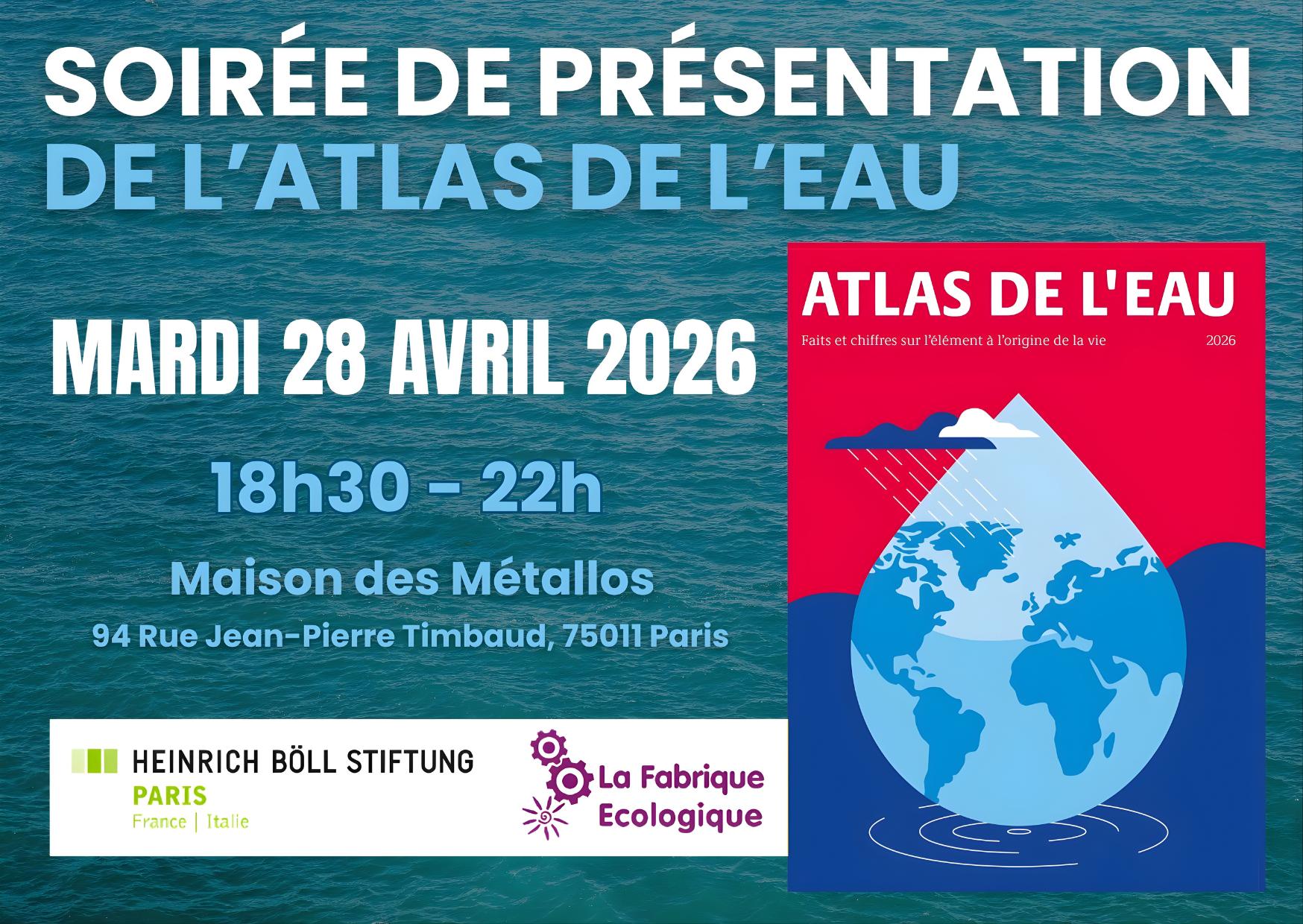 Nous vous invitons à notre soirée de lancement de l'Atlas de l'eau à Paris, à la Maison des Métallos à Paris 11e, ce mardi 28 avril de 18h30 à 22h