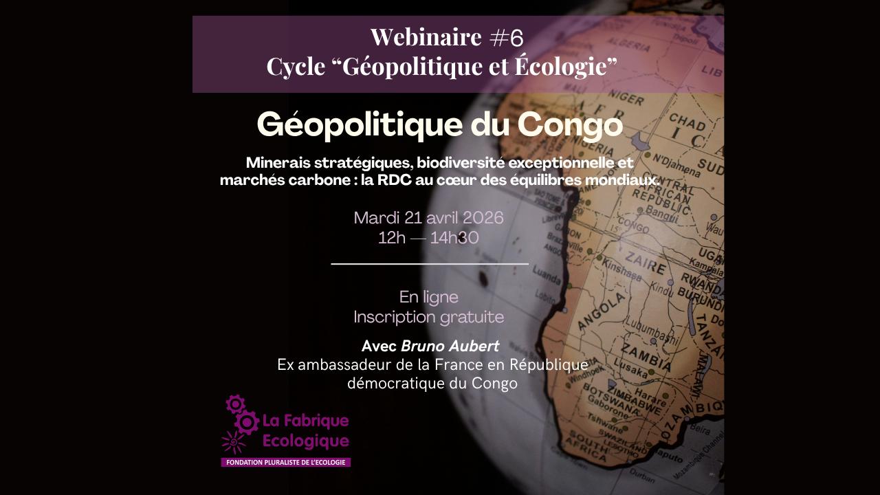 Pour répondre à ces questions, ce webinaire proposera un dialogue entre Lucile Schmid, présidente de La Fabrique Écologique, et Bruno Aubert, ambassadeur de la France en République démocratique du Congo.